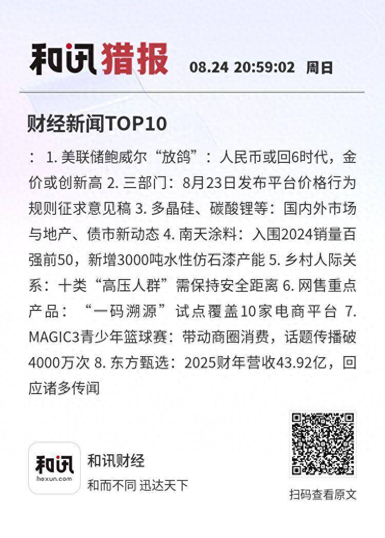 财经新闻TOP10:1. 美联储鲍威尔“放鸽”:人民币或回6时代,金价或创新高2. 三部门:8月23日发布平台价格行为规则征求意见稿3. 多晶硅、碳酸锂等:国内外市场与地产、债市新动态4. 南天涂料:入围2024销量百强前50,新增3000吨水性仿石漆产能5. 乡村人际关系:十类“高压人群”需保持安全距离6. 网售重点产品:“一码溯源”试点覆盖10家电商平台7. MAGIC3青少年篮球赛:带动商圈消费,话题传播破4000万次8. 东方甄选:2025财年营收43.92亿,回应诸多传闻
